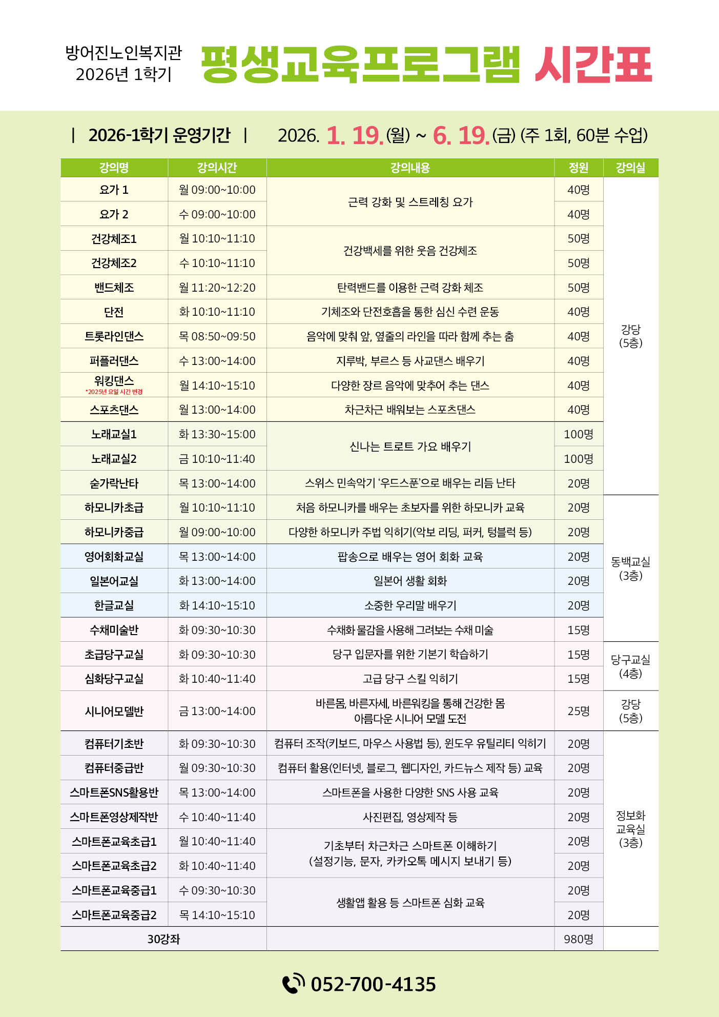 1. Á¢¼ö±â°£ : 2025. 12. 15(¿ù) ~ 12. 18(¸ñ), 4Àϰ£ 09:00~16:00 ¡Ø Á¡½É½Ã°£ Á¦¿Ü 12:30~13:30 2. Á¢¼öÀå¼Ò : º¹Áö°ü 4Ãþ ·Îºñ 3. ´ë »ó : º¹Áö°ü ȸ¿ø 4. Á¢¼ö¹æ¹ý : ȸ¿øÁõ ÁöÂüÇÏ¿© º»ÀÎ ¹æ¹® Á¢¼ö(´ë¸®Á¢¼ö ºÒ°¡) **1ÀÎ 3°ú¸ñ ½Åû °¡´É **Á¢¼ö±â°£ ¹× ½Ã°£ ¾ö¼ö 5. Ãß÷ : 2025. 12. 19(±Ý) 17½Ã ÀÌÈÄ ´ç÷ÀÚ °³º°¹®ÀÚ¹ß¼Û 6. ¼ö³³ : 2026. 01. 05(¿ù) ~ 01. 07(¼ö) 09:00~16:00, 4Ãþ »ç¹«½Ç ¡Ø Á¡½É½Ã°£ Á¦¿Ü 12:30~13:30 7. ¼ö°·á : ±Ý25,000¿ø(Çö±Ý³³ºÎ, ºÐÇÒ³³ºÎX) **¼ö³³ ½Ã ±âÃÊ»ýȰ¼ö±ÞÀÚ, Â÷»óÀ§°èÃþ Áõºù¼·ù Á¦Ãâ ¿Ï·á ½Ã ¹«·á ¼ö° °¡´É 8. ¿î¿µ±â°£ : 2026. 01.19(¿ù) ~ 06.19(±Ý)