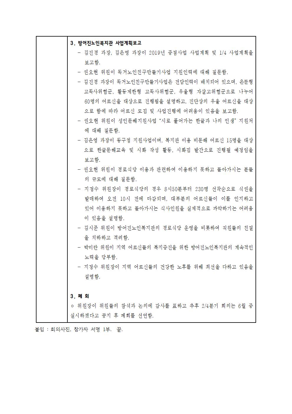 ¹æ¾îÁø³ëÀκ¹Áö°ü ¿î¿µÀÇ Åõ¸í¼ºÀ» È®º¸Çϰí Áö¿ªÀÇ ¾î¸£½Åµé¿¡°Ô Áú³ôÀº ¼­ºñ½º¸¦ Á¦°øÇϱâ À§ÇÏ¿© 1Â÷ ¿î¿µÀ§¿øÈ¸°¡ 2019.03.20.(¼ö) 11:30 ´ë¿Õ¾Ï¾Æ±¸Âò¿¡¼­ ½Ç½ÃµÇ¾ú½À´Ï´Ù.