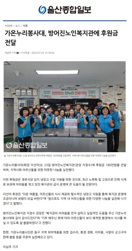 [¿ï»êÁ¾ÇÕÀϺ¸] °¡¿Â´©¸®ºÀ»ç´ë, ¹æ¾îÁø³ëÀκ¹Áö°ü ÈÄ¿ø±Ý Àü...