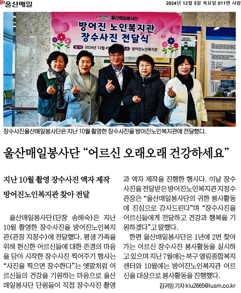 [¿ï»ê¸ÅÀÏ] ¿ï»ê¸ÅÀϺÀ»ç´Ü ¹æ¾îÁø³ëÀκ¹Áö°ü¿¡ Àå¼ö»çÁø Àü...