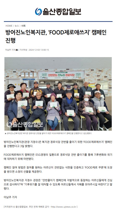 [¿ï»êÁ¦ÀÏÀϺ¸] ¹æ¾îÁø³ëÀκ¹Áö°ü 'FOODÁ¦·Î¾Ö¾²Áö...