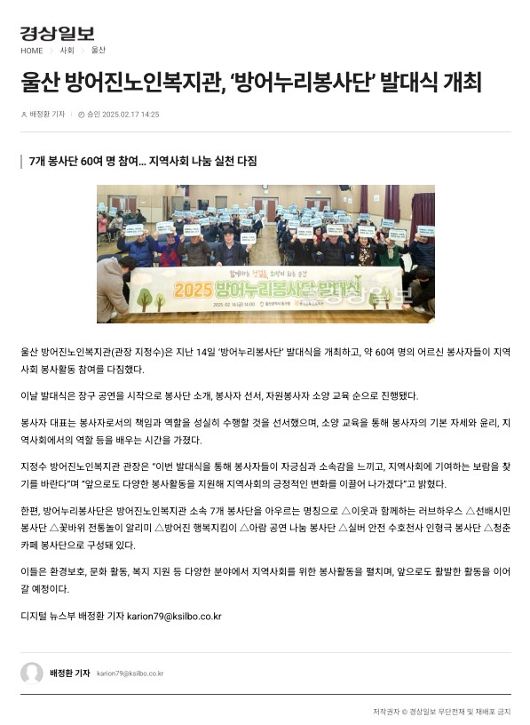 [°æ»óÀϺ¸] ¿ï»ê ¹æ¾îÁø³ëÀκ¹Áö°ü, ¹æ¾î´©¸®ºÀ»ç´Ü ¹ß´ë½Ä ...