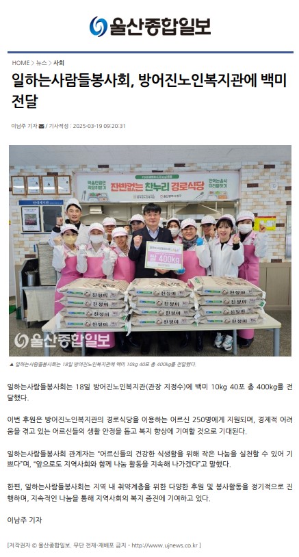 [¿ï»êÁ¾ÇÕÀϺ¸] ÀÏÇϴ»ç¶÷µéºÀ»çȸ, ¹æ¾îÁø³ëÀκ¹Áö°ü ¹é¹Ì...