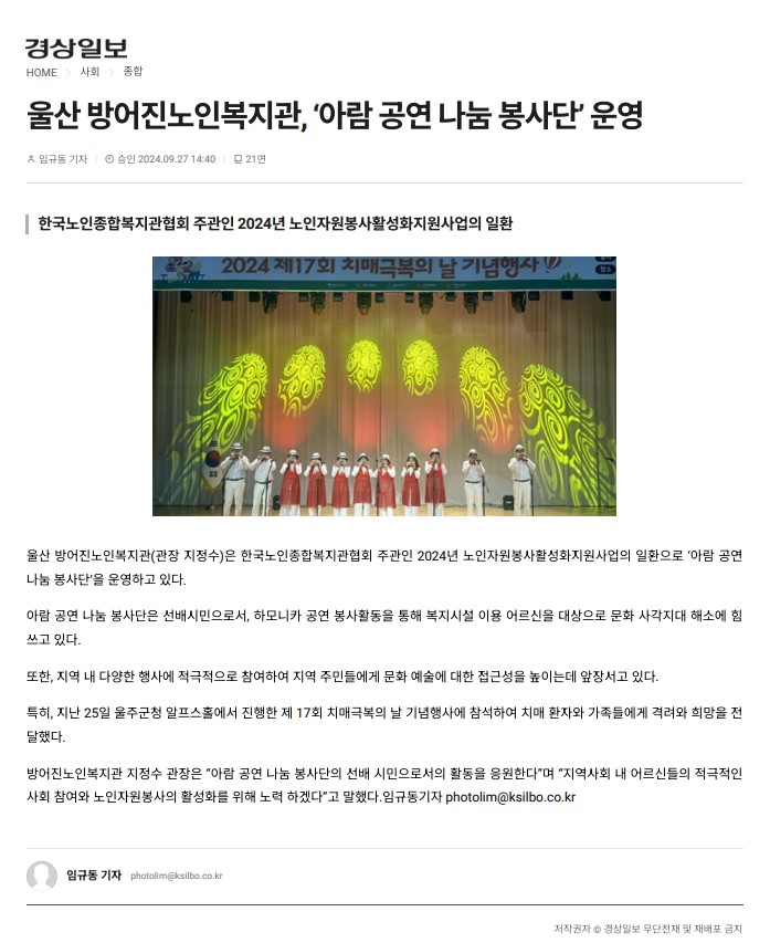 [°æ»óÀϺ¸] ¹æ¾îÁø³ëÀκ¹Áö°ü '¾Æ¶÷ °ø¿¬ ³ª´® ºÀ»ç´Ü ...